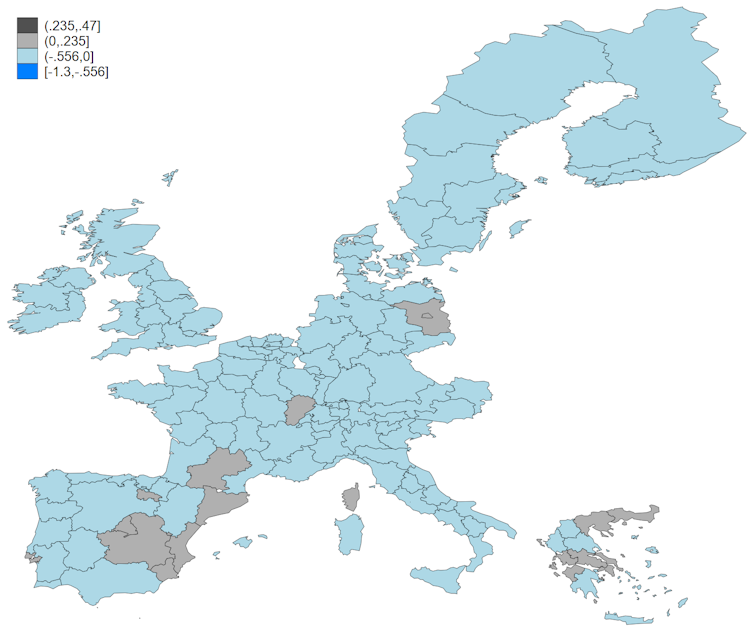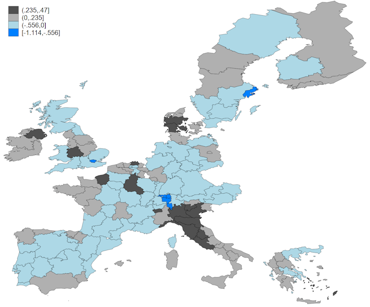 A prevalence of low-skilled immigration increased nationalist voting in Italy, and in several regions in the UK, Denmark, and France (light and dark grey areas). Conversely, a predominance of high-skilled migration predicted a reduction of nationalist voting in regions such as Madrid (Spain), Provence-Alpes-Côte d’Azur (France), Zurich (Switzerland) and Greater London (UK) (areas in light and dark blue).