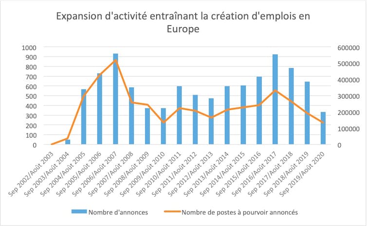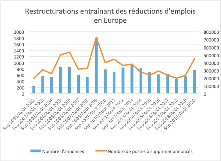 Le graphique ci-dessus, illustrant l’évolution du nombre d’annonces de restructuration entraînant les réductions d’emplois en Europe, confirme ces tendances. Les annonces des suppressions d’emplois s’intensifient pendant la crise de 2007-2009 et la crise sanitaire de la Covid-19.