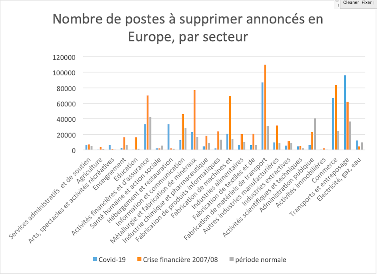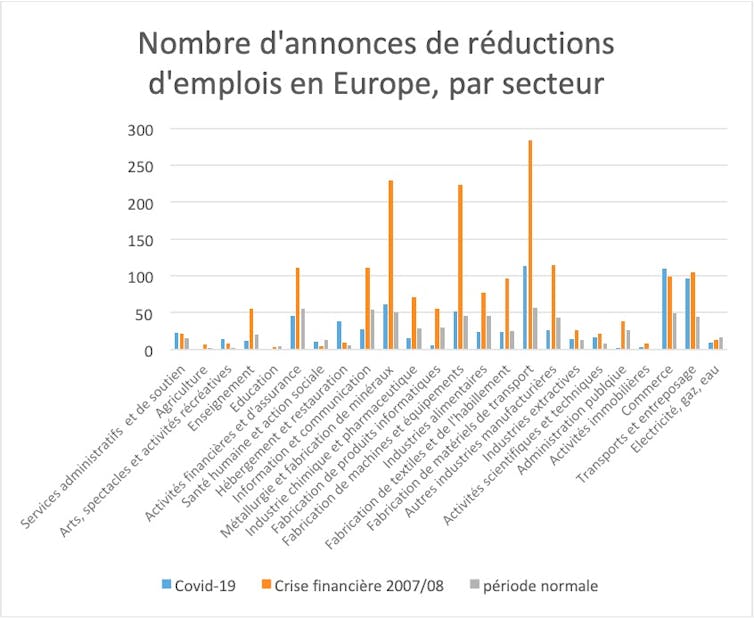 Comme nous pouvons le voir, des crises sont des chocs qui forcent les entreprises à agir en conséquence. Toutefois, il y a quelques différences importantes entre les deux crises. Tout d’abord, la réaction à la crise financière était retardée, car il y a eu un décalage entre le moment où les premiers signes de la crise sont apparus (2007, puis confirmation en 2008) et le recours à des mesures de licenciements collectifs.