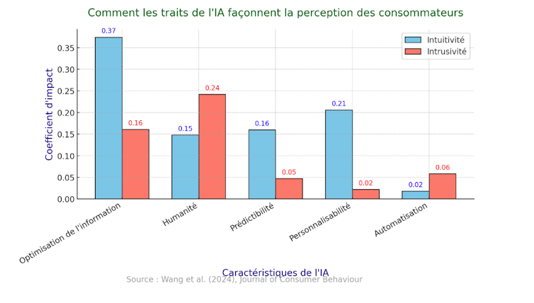 Dans notre étude, publiée dans le Journal of Consumer Behaviour, nous avons interrogé des consommateurs pour explorer l’impact des systèmes de recommandation d’IA sur leur bien-être « technologique ». Cinq caractéristiques clés qui façonnent les réponses des consommateurs ont été identifiées :
