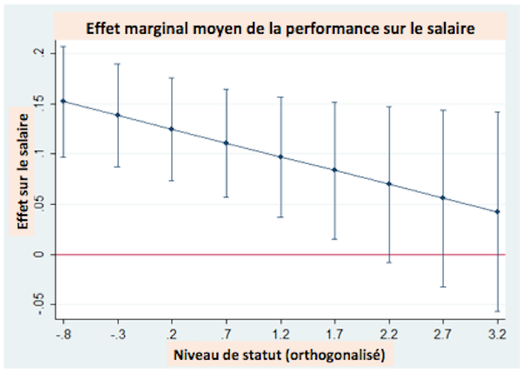 Notre étude montre donc que la rémunération d’un joueur est moins déterminée par ses performances lorsqu’il joue régulièrement pour l’équipe nationale et bénéficie donc d’un statut élevé que lorsque cela n’est pas le cas.