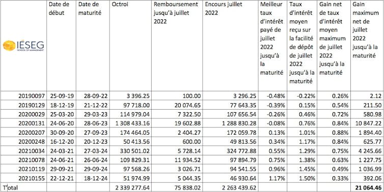 Le taux à payer par les banques sur ces emprunts à l’Eurosystème, qui regroupe la BCE et les banques centrales nationales des États membres de la zone euro, est fonction de la quantité de prêts éligibles qu’elles octroient au secteur privé. Jusqu’au 23 juin 2022, le meilleur taux possible sur les TLTRO 3, pour les banques qui maintiennent leur quantité de prêts au-dessus d’une certaine limite, a été de -1 %.