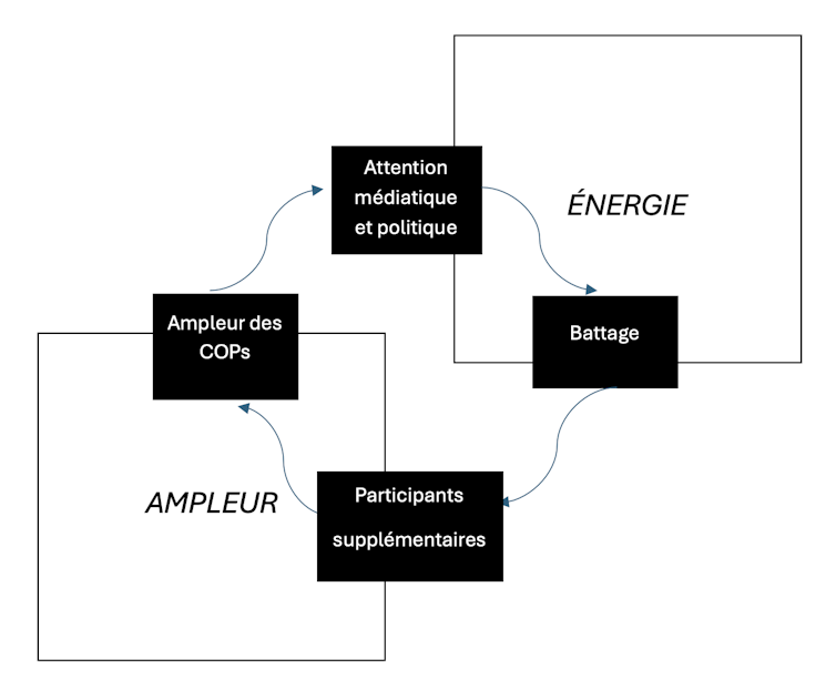 À mesure que les COP ont pris de l’ampleur, elles ont suscité de plus en plus d’attention de la part des milieux politiques et des médias, au point d’être désormais considérées comme « un événement où il faut absolument être présent ». Cela incite les organisations non gouvernementales et d’autres acteurs non étatiques à y participer. Tout comme la force gravitationnelle des grands corps massifs attire d’autres objets vers eux, la masse des « méga-COP » attire un nombre croissant de participants, en un cycle qui ne cesse de se renforcer et devient difficile à briser.