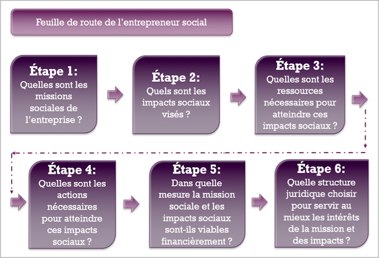 Lors du lancement d’une entreprise sociale, l’élaboration du business model reste donc une étape aussi cruciale que compliquée. Pour éclairer les entrepreneurs sociaux, nous avons mené une recherche qui a permis l’élaboration d’une feuille de route (voir ci-dessous) pour les aider dans leur analyse.